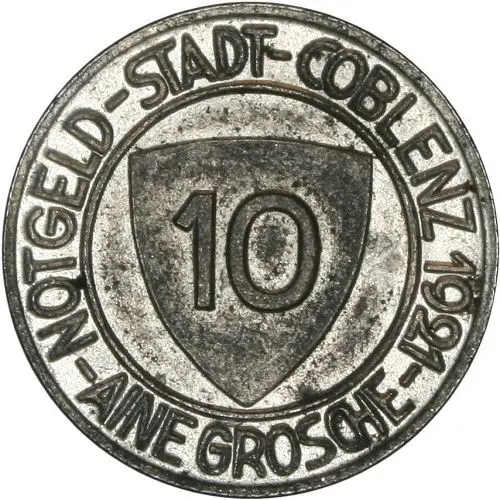| Obverse lettering | NOTGELD - STADT - COBLENZ 1921 10 - AINE GROSCHE - |