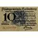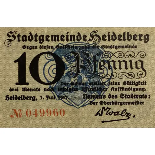 Lettering (regular font): Stadtgemeinde Heidelberg Gegen diesen Gutschein zahlt die Stadtgemeinde 10 Pfennig Der Schein verliert seine Gültigkeit drei Monate nach erfolgter öffentlicher Aufkündigung. Heidelberg,1.Juli 1917 Namens der Stadtrats: Der Oberbürgemeister |