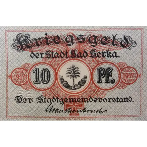 | Obverse lettering | Kriegsgeld der Stadt Bad Berka. 1917 10 Pf. 1917 Der Stadtgemeindevorstand. RENECK & KLEIN WEIMAR |