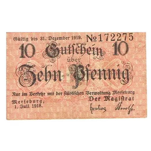 | Leyenda del anverso | 10 Gutschein 10 über Zehn Pfennig Nur im Verkehr mit der städtischen Verwaltung Merseburg Merseburg, 1. Juli 1918 |