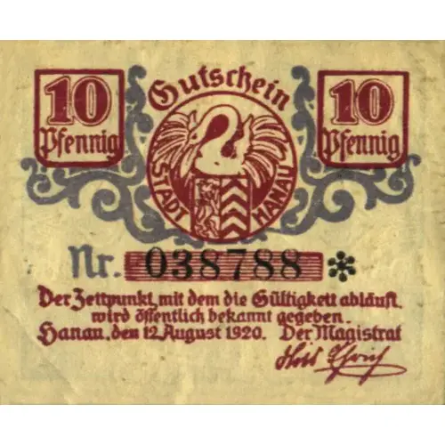 | Obverse lettering | 10 Pfennig Gutschein 10 Pfennig Der Zeitpunkt, mit dem die Gültigkeit abläuft, wird öffentlich bekannt gegeben. Hanau, den 12. August 1920. Der Magistrat |