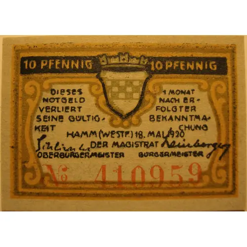 | Vorderseitenlegende | Hamm 18 mai 1920 10 pfennig No.410959 |