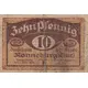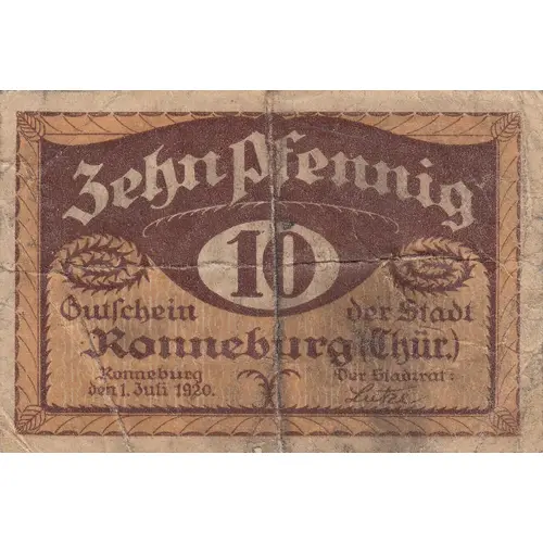 | Надписи лицевой стороны | Zehn Pfennig 10 Gutschein der Stadt Ronneburg (Thür.) Ronneburg den 1. Juli 1920. Der Stadtrat: |