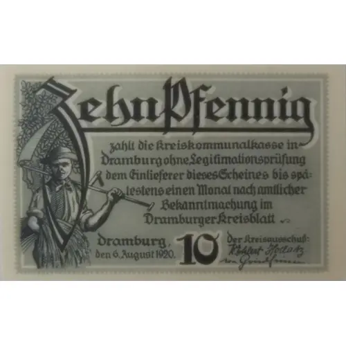 Zehn Pfennig zahlt die Kreiskommunalkasse in Dramburg ohne Legitimationsprüfung dem Einlieferer dieses Scheins bis spätestens einen Monat nach amtlicher Bekanntmachung im Dramburger Kreisblatt Dramburg, den 6. August 1920 Der Kreisausschuß: (Translation: The municipal treasury of Dramburg pays 10 pfennigs to the consignor of this ticket no later than one month after official publication in the district newspaper of Dramburg without verification of legitimacy Dramburg, 6 August 1920 The county committee:) |