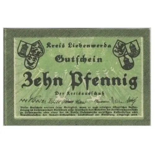Kreis Liebenwerda Gutschein Zehn Pfennig (Translation: Liebenwerda district Voucher Ten pfennigs) |