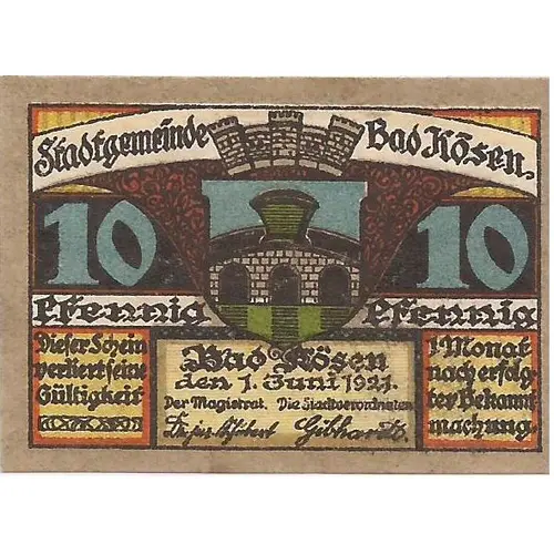 Stadtgemeinde Bad Kösen 10 Pfennig 10 Pfennig Dieser Schein vereliert seine Gültigkeit 1 Monat nach erfolgter Bekanntmachung. Bad Kösen den 1.juni 1921. Der Magistrat. Die Stadtverordneten |