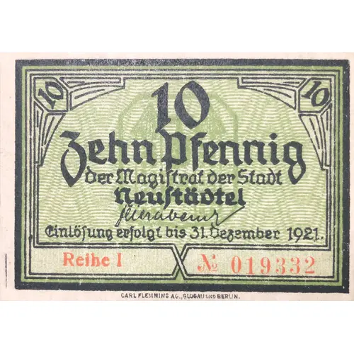 Die Einlösung dieses scheines muß bis zum 31. Dezember 1921 beld Stadt Hauptkasse Stadt Neustädtel Erfolgt sein andernfalis der Schein Verfällt Der Magistrat der stadt Neustädtel (Translation: The redemption of this voucher must be paid by December 31, 1921 City main cash desk in the city of Neustadtel otherwise the certificate expires The magistrate of the city of Neustädtel) |