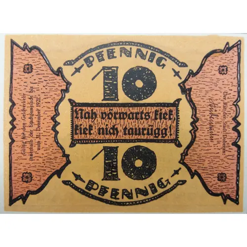 | Obverse lettering | PFENNIG 10 Nah vörwarts tief, tief nich taurügg! 10 PFENNIG Gültig für den Geldverkehr innerhalb der Stadtgemeinde bis zm 31. Dezember 1921 Der Rat der Stadt Doberan |