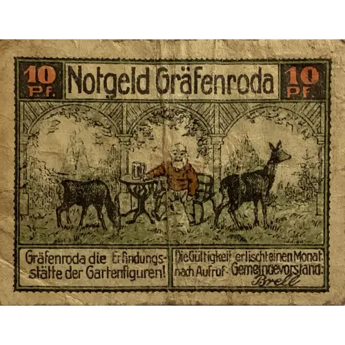 10 Pf(2) Notgeld Gräfenroda Gräfenroda die Erfindungsstätte der Gartenfiguren! Die Gültigkeit erlischt einen Monat nach Aufruf Gemeindevorstand: |