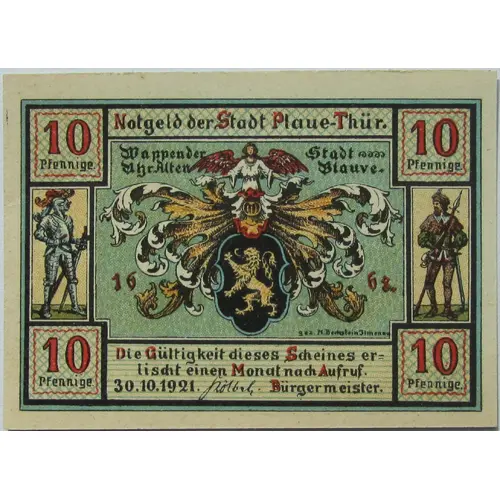 Notgeld der Stadt Plaue-Thür. Wappen der Uhr.Alten Stadt ~ Blauve. 1668. gez. M. Bechstein Ilmenau Die Gültigkeit dieses Scheines er= lischt einen Monat nach Aufruf. 30.10.1921 (signature) Bürgermeister. |