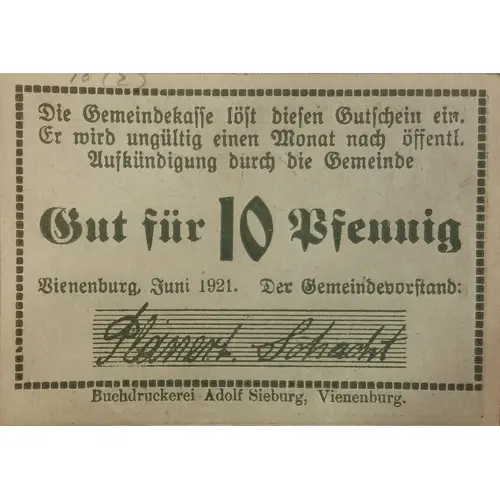 | Obverse lettering | Die Gemeindekasse löst diesen Gutschein ein. Er wird ungültig einen Monat öffentl. Aufkündigung durch die Gemeinde. Gut für 10 Pfennig Vienenburg, Juni 1921. Der Gemeindevorstand: Buchdruckerei Adolf Sieburg, Vienenburg |