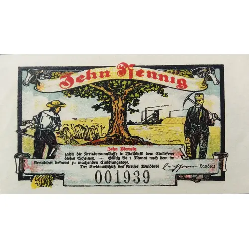 | نوشتههای روی اسکناس | Zehn Pfennig Zehn Pfennig zahlt die Kreiskomunalkasse in Waldbröl dem Enlieferer dieses Scheines - Gültig bis 1 Monat nach dem im Kreisblatt bekannt machenden Einlösunglage. Der Kreisaufschuss des Kreises Waldbröl Landrat 001939 |