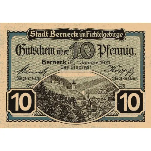 Stadt Berneck im Fichtelgebirge Gutschein über 10 Pfennig Berneck i. F. 1. Januar 1921. Der Stadtral Burgermeister Stadtkassier (Translation: City of Berneck in the Fichtel Mountains Voucher for 10 pfennigs Berneck i. F. January 1, 1921. The City Mayor City Treasurer) |