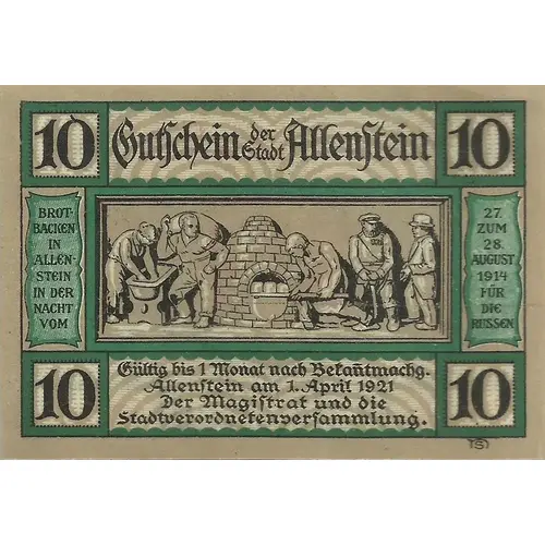 | Obverse lettering | 10 10 Gutschein der Stadt Allenstein BROT PACKEN IN ALLENSTEIN IN DER NACHT VOM 27. ZUM 28. AUGUST 1914 FÜR DIE RUSSEN Gültig bis 1 Monat nach Bekantmachg. Allenstein am 1.April 1921 Stadtverordnetenversammlung. 10 10 |