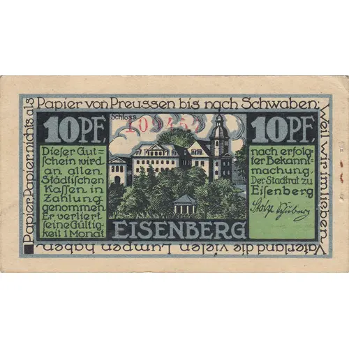 | Надписи лицевой стороны | 10 PF. Schloss 10 PF. Eisenberg Dieser Gut= schein wird an allen Städtischen Kassen in Zahlung genommen. Er verliert seine Gültig- keit 1 Monat nach erfolg= ter Bekannt= machung. Der Stadtrat zu Eisenberg Papier, Papier, nichts als Papier von Preussen bis nach Schwaben: Weil wir im lieben Vaterland die vielen Lumpen haben. |