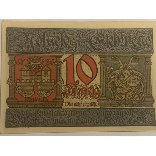 Lettering (regular font): NOTGELD DER STADT ESCHWEGE 1720 10 Pfennig CONSVLES Wird nicht eingelöst Von Feuerschaden und Feindes Pott Bewahrt uns in Sraden Herre Gott |