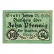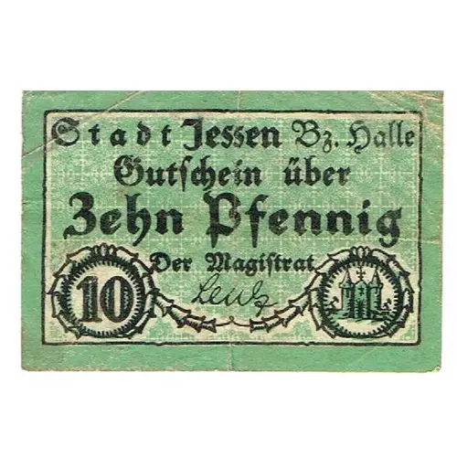 | Obverse lettering | Stadt Jessen Bz. Halle Gutschein über Zehn Pfennig Der Magistrat |