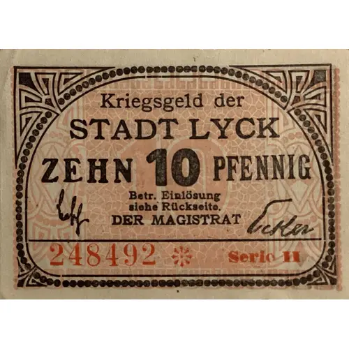 Kriegsgeld der STADT LYCK ZEHN 10 PFENNIG Betr.Einlösung siehe Rückseite DER MAGISTRAT |