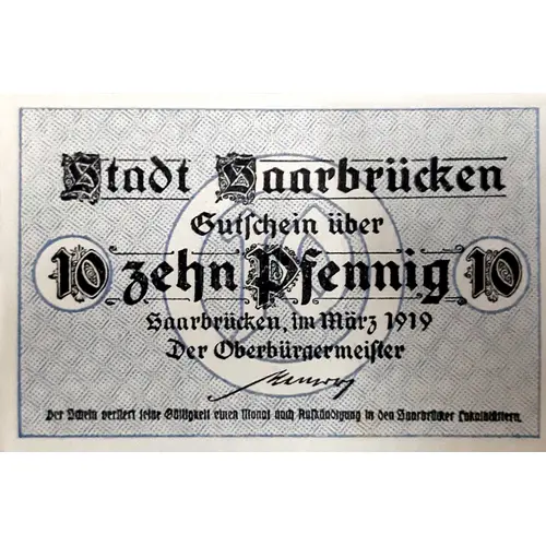 Stadt Saarbrucken Guffshein uber 10 Zehn Pfennig 10 Saarbrucken, im Marz 1919 Der Oberburgermeister (unknown small lettering at bottom) |