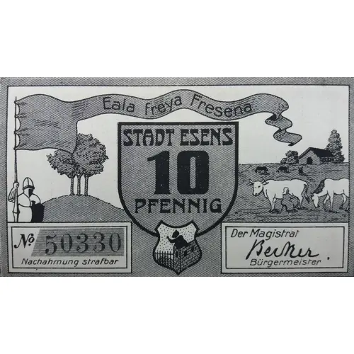 Obverse lettering Eala freya Fresena STADT ESENS 10 PFENNIG No. 50330 Nachahmung strafbar Der Magistrat Bürgermeister
