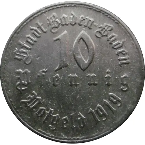 | 正面铭文 | Stadt Baden-Baden 10 Pfennig Notgeld 1919 |
