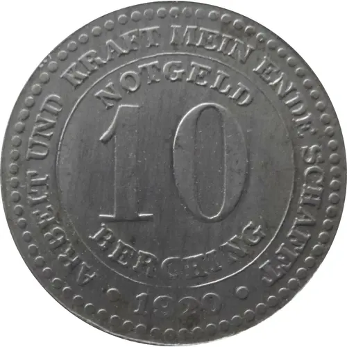 | Obverse lettering | ARBEIT UND KRAFT MEIN ENDE SCHAFFT NOTGELD 10 BERCHING ● 1920 ● |