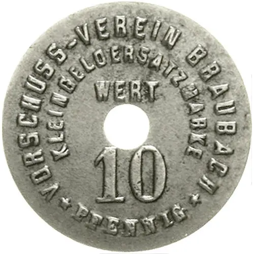 | Opis líce | VORSCHUSS-VEREIN BRAUBACH KLEINGELDERSATZMARKE WERT 10 ★ PFENNIG ★ |