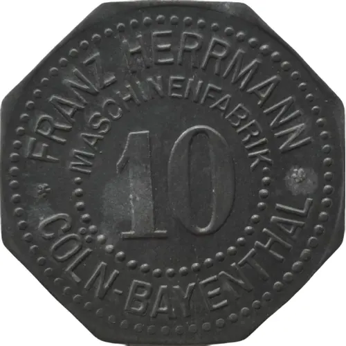 | Obverse lettering | FRANZ HERRMANN MASCHINENFABRIK 10 ✿ CÖLN-BAYENTHAL ✿ |