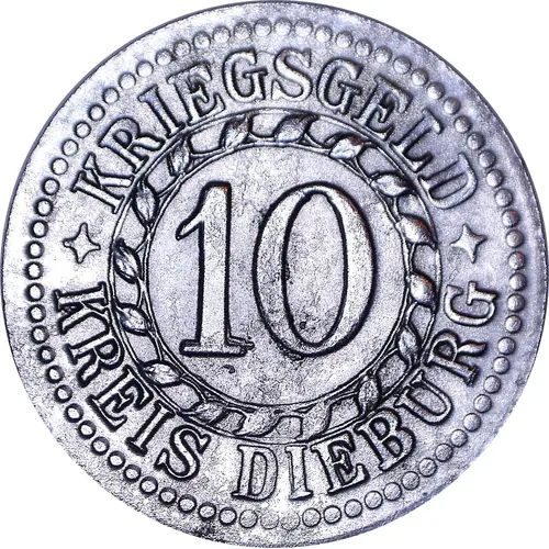 | Obverse lettering | KRIEGSGELD 10 ✦ KREIS DIEBURG ✦ |