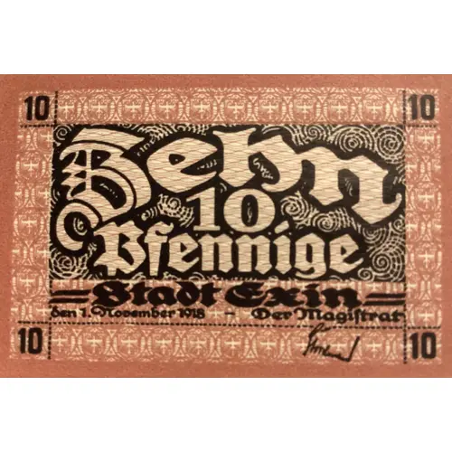 | Reverse description | Lettering (regular font): 10(4) ZEHN 10 PFENNIGE Stadt Exin Den 1.November 1918 Der Magistrat |