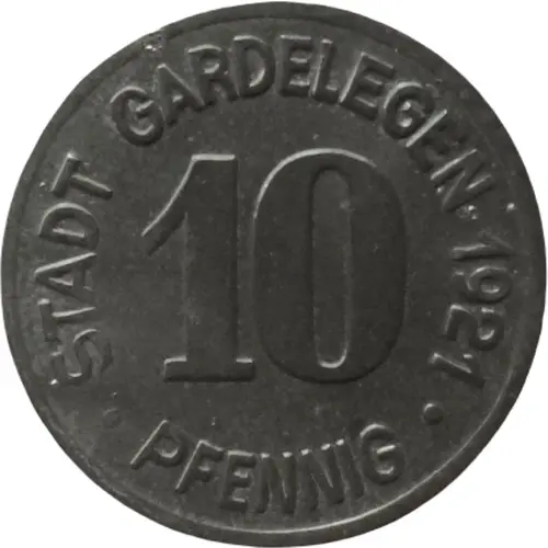 | Légende de l’avers | STADT GARDELEGEN 1921 10 ● PFENNIG ● |