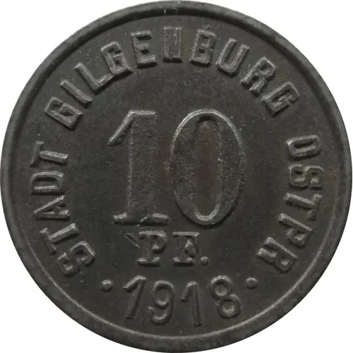 | Obverse lettering | STADT GILGENBURG OSTPR. 10 PF. ● 1918 ● |