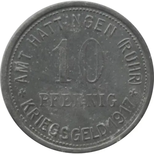 | Obverse lettering | AMT HATTINGEN (RUHR) 10 PFENNIG ✚ KRIEGSGELD 1917 ✚ |