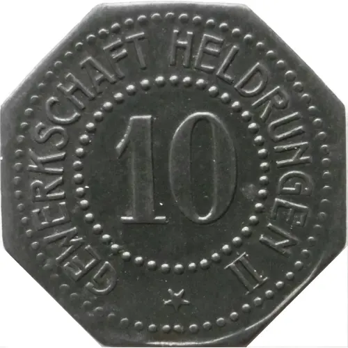 | Obverse lettering | GEWERKSCHAFT HELDRUNGEN II 10 ★ |