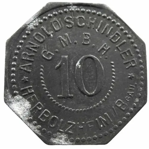Historical Context: This 10 Pfennig coin from Herbolzheim is a prime example of German Notgeld, or emergency money. Issued by the City of Herbolzheim, likely during the post-World War I hyperinflationary crisis, it addressed the acute shortage of small change and the rapid devaluation of national currency. The designation "Arnold Schindler" suggests a specific local merchant or guarantor associated with this municipal issue, underscoring the localized, provisional nature of such essential currency during a period of profound economic instability.