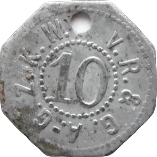 | Reverse lettering | KLEINGELDERSATZMARKE 10 ● KL. WANZLE. ● |
