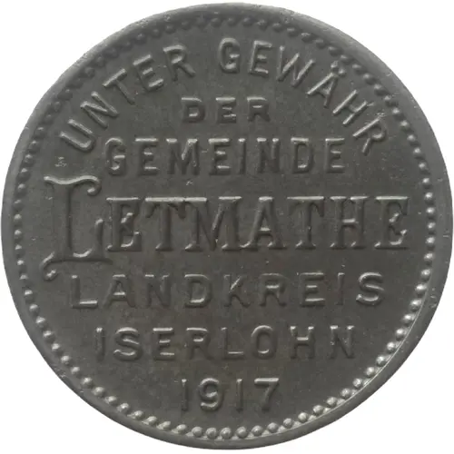 | Leyenda del anverso | UNTER GEWÄHR DER GEMEINDE LETMATHE LANDKREIS ISERLOHN 1917 |