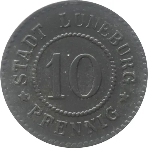 | Legenda do anverso | STADT LÜNEBURG 10 ★ PFENNIG ★ |
