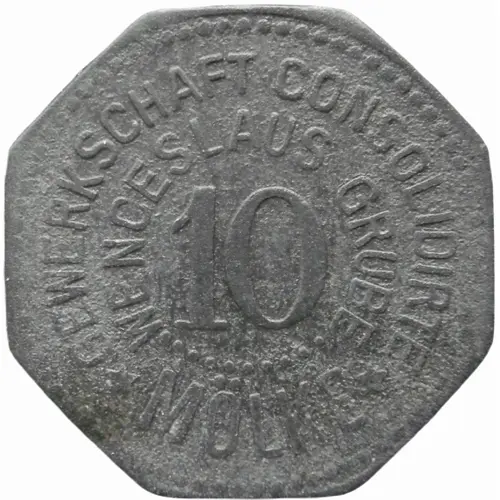 | Obverse lettering | GEWERKSCHAFT CONSLIDIRTE WENCESLAUS GRUBE 10 ★ MÖLKE ★ |