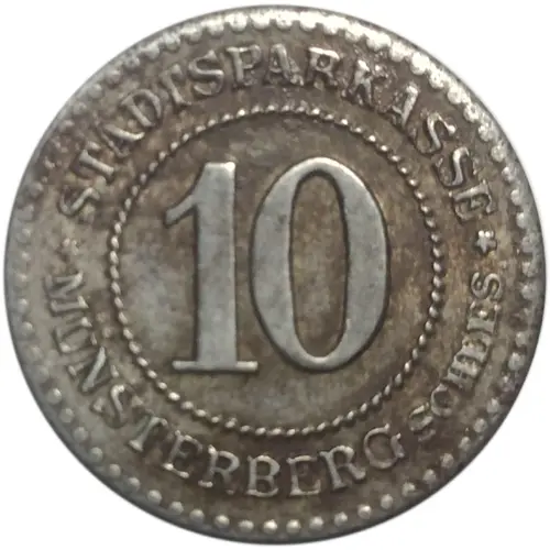 | Надписи аверса | STADTSPARKASSE 10 ★ MÜNSTERBERG SCHLES. ★ |