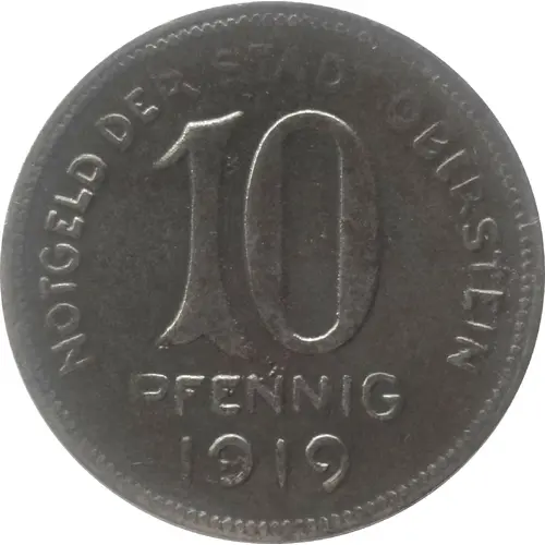| Obverse lettering | NOTGELD DER STADT OBERSTEIN 10 PFENNIG 1919 |