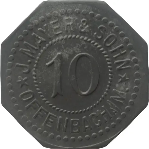 | Obverse lettering | J. MAYER & SOHN 10 ★ OFFENBACH A/M. ★ |