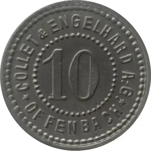 | Obverse lettering | COLLET & ENGELHARD A.-G. 10 ★ OFFENBACH ★ |