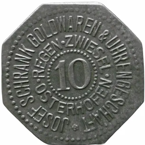 | Obverse lettering | JOSEF SCHRANK GOLDWAREN & UHRENGESCHAFT REGEN ✿ ZWIESEL ✿ OSTERHOFEN 10 ✿ |