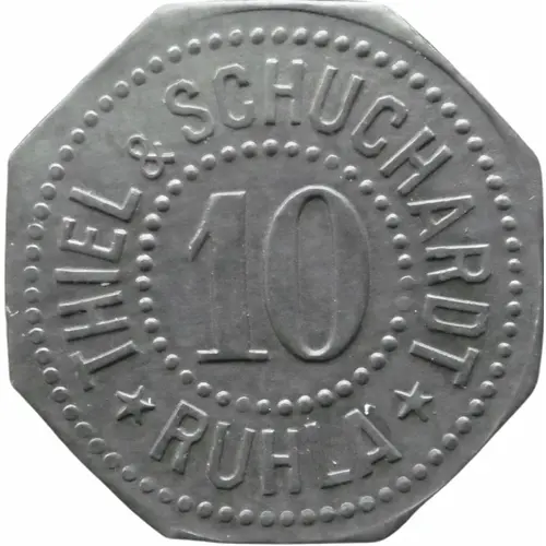 | Obverse lettering | THIEL & SCHUCHARDT 10 ★ RUHLA ★ |