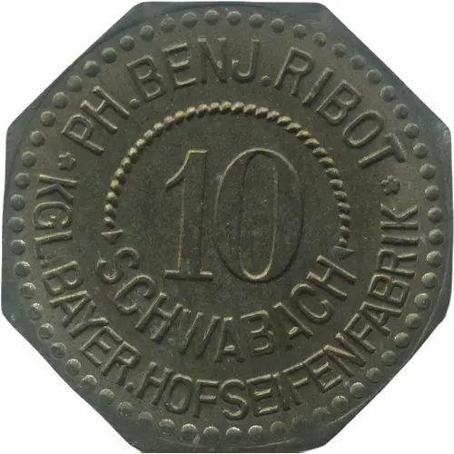 | Ön yüz lejandı | PH. BENJ. RIBOT 10 ★ SCHWABACH KGL. BAYER. HOFSEIFENFABRIK ★ |