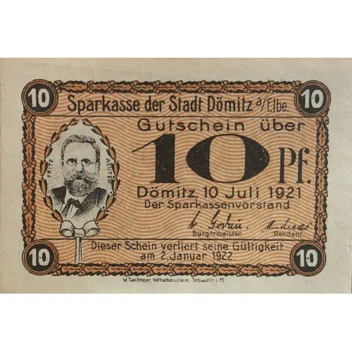 | Vorderseitenlegende | 10 10 10 10 FRITZ REUTER Sparkasse der Stadt Dömitz Gutschein über 10 Pf. Dömitz, 10 Juli 1921 Der Sparkassevorstand Bürgermeister. Rendant. Dieser Schein verliert seine Gültigkeit am 2. Januar 1922 W.Sandmeyer Hobuchdrückerei Schwerin i.M. |
