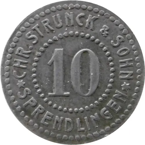 | Obverse lettering | CHR. STRUNCK & SOHN 10 ✶ SPRENDLINGEN ✶ |