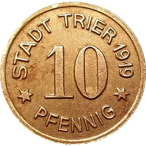 | Opis líce | STADT TRIER 1919 10 ✶ PFENNIG ✶ |