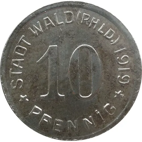 Obverse lettering STADT WALD (RHLD.) 1919 10 ★ PFENNIG ★